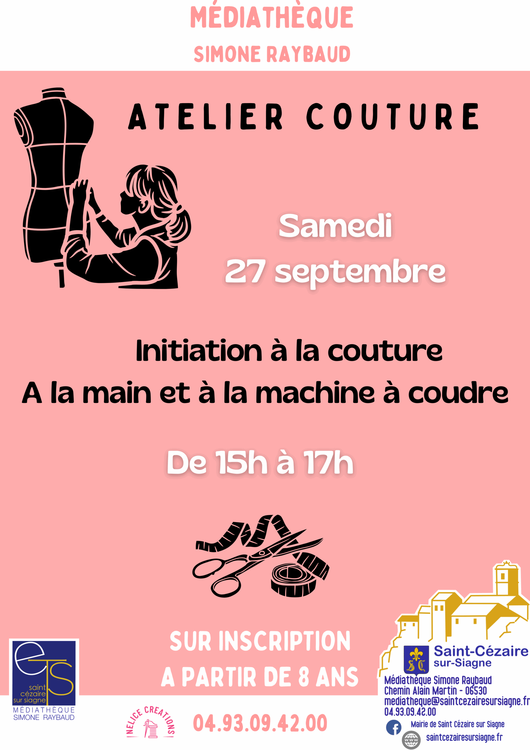 Le samedi 27 septembre, j'aurai le plaisir d’animer un atelier couture à la médiathèque Simone Raybaud de Saint-Cézaire-sur-Siagne.